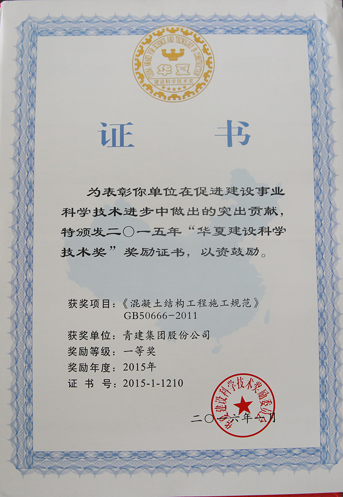 Recently, Construction Science and Technology Awards Committee of China issued decisions on 2015 “Construction Science and Technology Prize of China”. The national standard CB50666-2011 Code for Construction of Concrete Structures won the First Prize of Construction Science and Technology Prize of China, in which, CNQC participated in its preparation. In this year, 120 wining projects are selected, in which, there are 13 projects winning the First Prize, 28 projects winning the Second Prize and 79 projects winning the Third Prize.