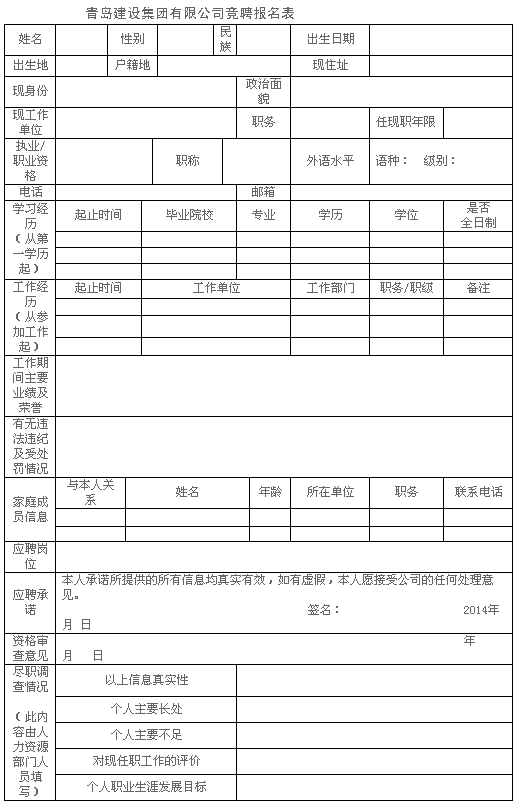 請下載附件中《青島建設(shè)集團(tuán)有限公司競聘報(bào)名表》,按要求填寫后,于2014年9月9日12點(diǎn)之前將電子版和書面版報(bào)聯(lián)系人;隨報(bào)本人畢業(yè)證、學(xué)位證及現(xiàn)有職業(yè)、執(zhí)業(yè)資格證書、各類獲獎(jiǎng)證書原件及復(fù)印件一份。