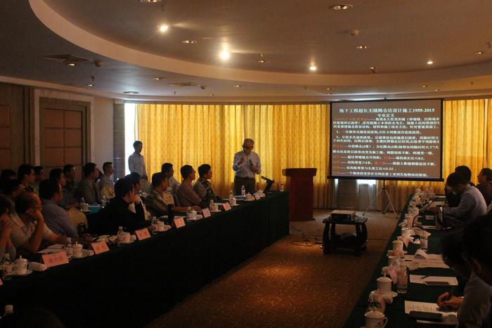 各子集團項目部人員就在建工程超長結構的設計與施工情況,及其存在的問題做了有針對性的匯報。隨后,王鐵夢教授對北京、上海、廣州等地區正在大量推廣的、效果顯著的“地下工程超長無縫跳倉法設計施工技術”做了生動的介紹,并結合具體工程案例,對集團在建超長結構工程中存在問題進行了詳細的講解。同時,王鐵夢教授還對集團在超長結構無縫施工的科研成果和工程應用給予了高度的評價。最后,與會人員就超長結構無縫施工的相關問題與王鐵夢教授進行熱烈的研討。